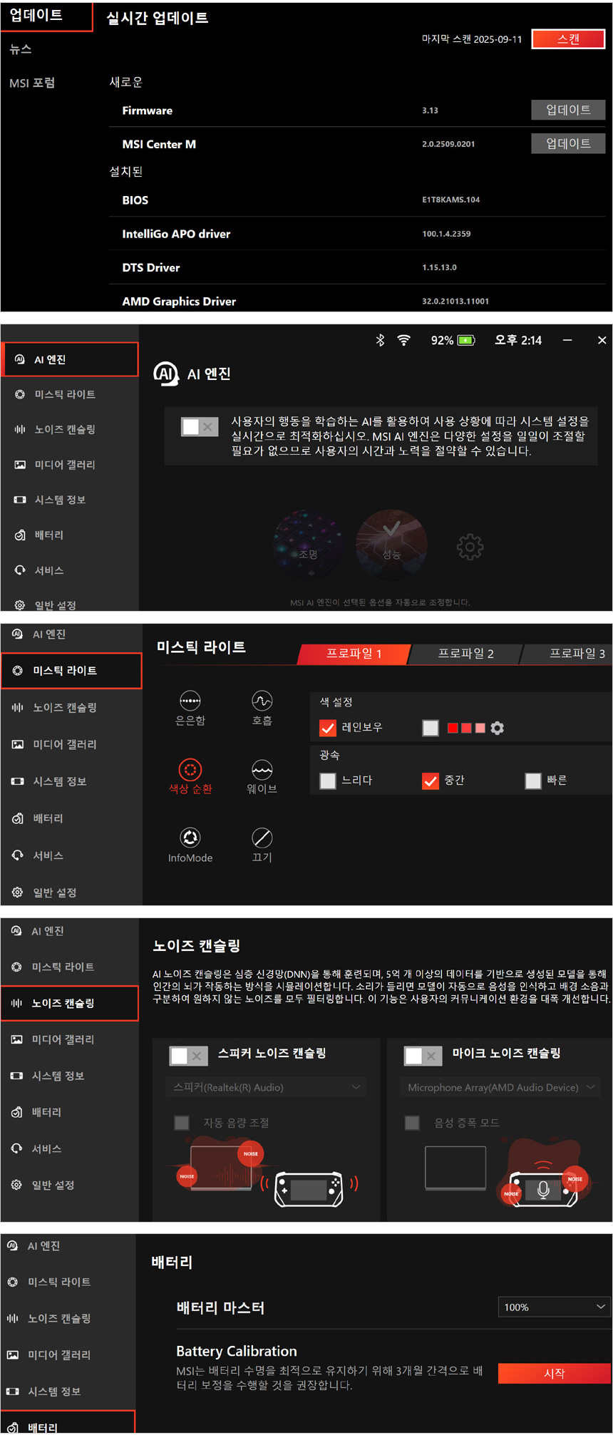 업데이트 지원으로 최상의 컨디션을 유지할 수 있으며 자동으로 기기를 셋팅할 수 있는 AI 엔진을 지원한다. 또한 미스틱 라이트의 조명 효과도 손쉽게 변경할 수 있으며 스피커와 마이크의 노이즈 캔슬링 지원으로 깔끔한 사운드를 즐길 수 있고 배터리 캘리브레이션도 지원한다.