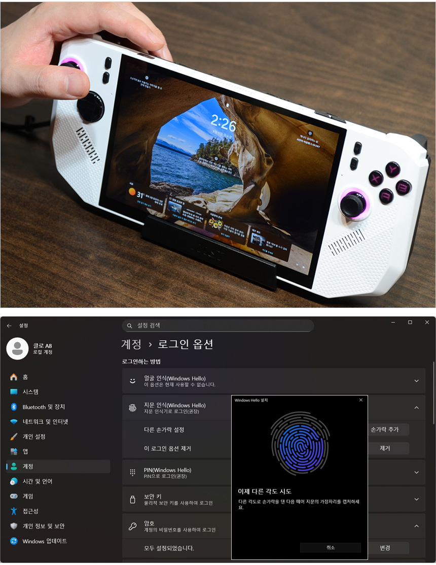 지문인식 센서를 장착해 보안성과 편의성을 높였다. 설정-계정에 있는 로그온 옵션에서 윈도우즈 헬로를 사용할 수 있으며 지문을 등록해 빠른 로그인이 가능하다. 외부에서 안심하고 사용할 수 있을 것이다.