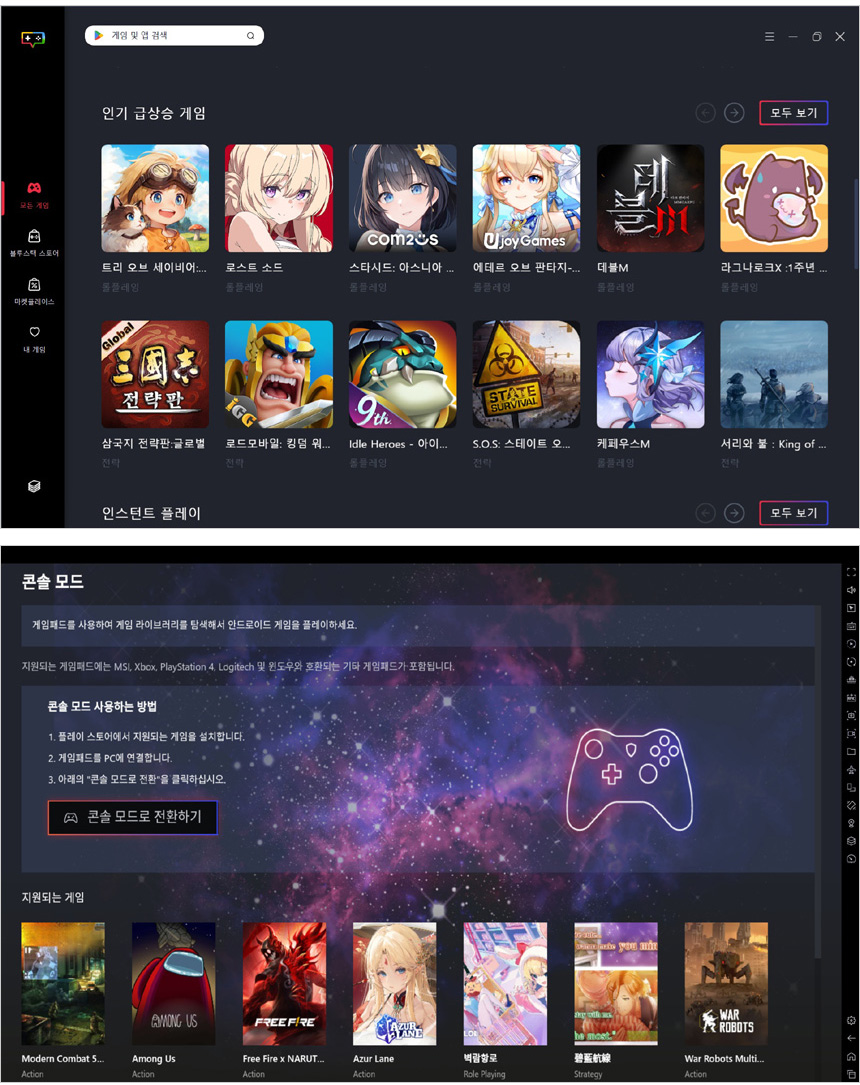MSI 앱 플레이어를 사용하면 모바일 게임도 즐길 수 있다. 키맵핑이 완료된 게임의 경우 별다른 설정없이 패드를 사용해 즐길 수 있으며 일부 유명 게임은 콘솔모드로 전환 후 원활하게 플레이 할 수 있었다. (지원되지 않는 게임의 경우 스마트폰과 같이 터치로 게임을 즐길 수 있다.)