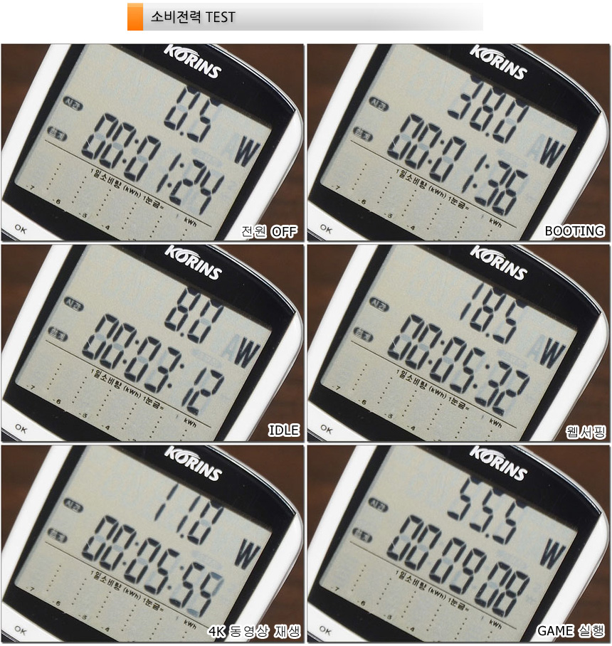 소비전력 테스트를 진행한 모습으로 (최고성능 모드) 캐주얼한 작업에서는 20W 내외의 낮은 소비전력으로 작동했으며 게임을 실행하면 소비전력이 50W 이상으로 올라가는 것을 확인할 수 있었다. (최대 55W 까지 올라갔으며 대부분 47~53W에서 게임이 실행되었다. 또한 소비전력이 낮아지는 스로틀링 현상은 발생하지 않았다.)