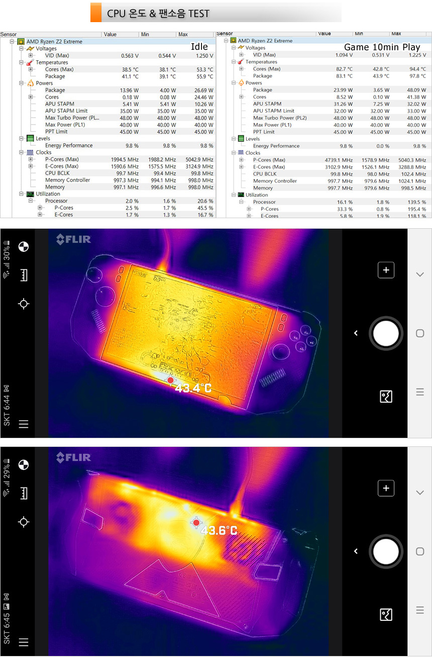 열화상 카메라를 이용해 게임 실행시 노트북의 열분포를 확인하고 있는 칩셋 부분과 통풍구 온도는 상당히 높은 것을 확인할 수 있다. (게임 실행시 절대 통풍구를 가리지 말기 바란다.) 손으로 쥐는 그립부의 온도가 낮아 게임실행 내내 열로 인한 스트레스는 없었다.