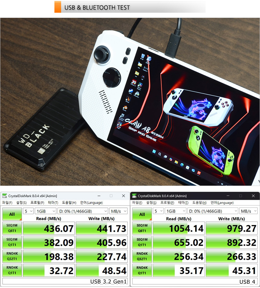 USB 4 단자를 지원해 고속 데이터 전송이 가능하다. 상단의 사진은 외장 SSD를 이용해 테스트를 진행하고 있는 모습으로 USB 3.2 Gen1과 확연한 속도 차이를 보여주었다. 대용량 데이터 전송이 잦은 유저들이라면 만족하며 사용할 수 있을 것이다.