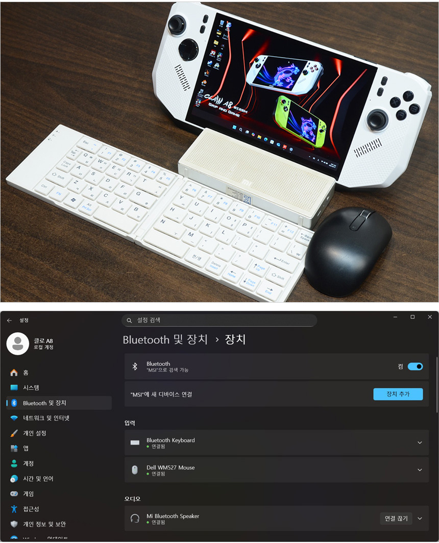 블루투스를 지원해 주변기기를 무선으로 연결해 활용할 수 있다. 상단의 사진은 외장 스피커와 키보드, 마우스를 이용해 페어링 테스트를 진행하고 있는 모습으로 원활하게 연결되는 것을 확인할 수 있었다.