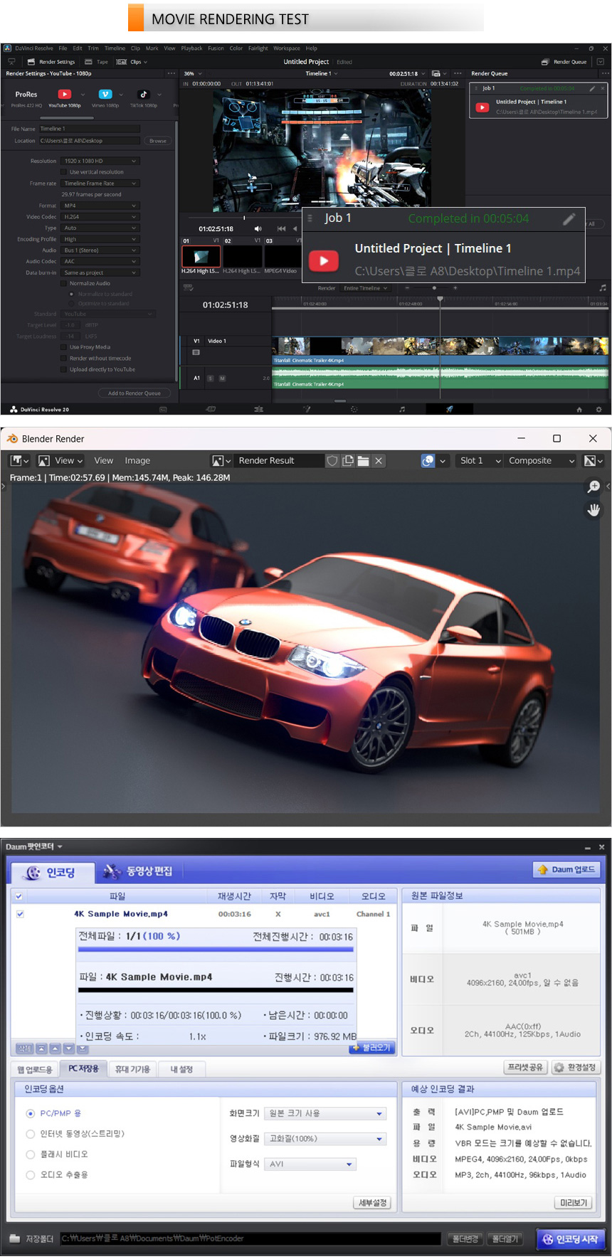 영상편집 S/W 다빈치 리졸브를 이용해 랜더링 테스트를 진행하고 있는 모습으로 (640MB, 920MB, 990MB 4K 동영상을 단일 동영상으로 랜더링, FHD 해상도에 H.264 비디오 코덱) 5분 04초가 소요되는 것을 확인할 수 있었으며 블랜더 랜더링 테스트에서는 2분대의 빠른 랜더링 시간을 보여주었다. 또한 4K 동영상의 인코딩을 진행했을 때 3분 16초의 빠른 인코딩 시간을 보여주었다. (루나레이크 258V 탑재 모델과 비교해 영상편집 랜더링 속도는 느렸지만 블랜더 랜더링과 인코딩 속도를 빨랐다.)