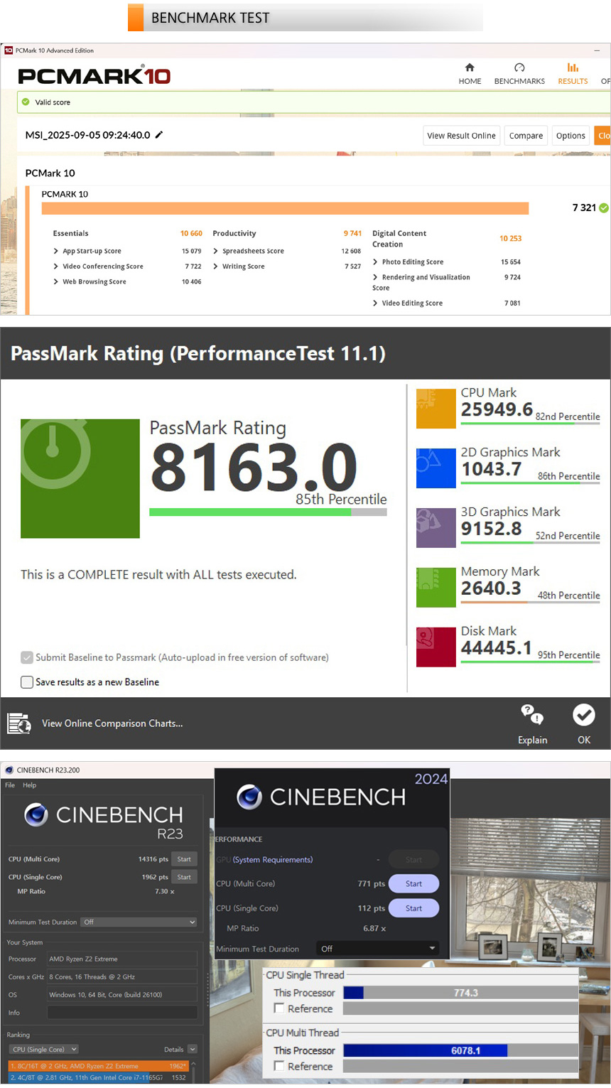 벤치마크 테스트를 진행하고 있는 모습으로 문서작업 뿐만 아니라 고성능을 필요로 하는 전문작업용 S/W도 부드럽게 실행할 수 있는 스코어를 보여주었다. (CPU 스코어가 상당히 높은 것이 인상적이다.)
