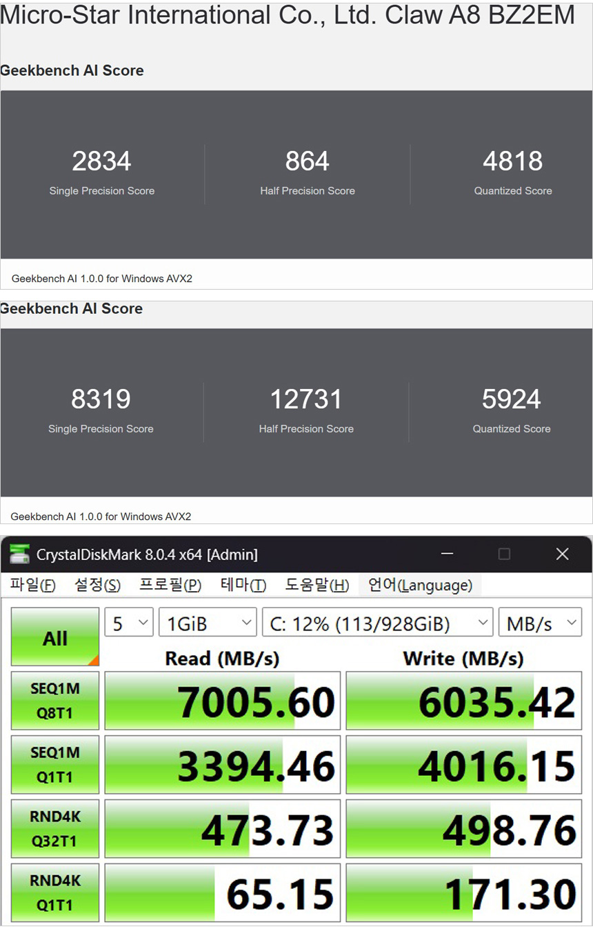 긱벤치 AI를 이용해 AI 성능을 확인해 보았는데 루나레이크가 탑재된 프리미엄 슬림 노트북들과 비교해도 떨어지지 않는 높은 스코어를 보여주었다. (NPU가 탑재된 루나레이크 258V 보다 높았다.) 또한 저장장치의 속도를 확인하고 있는 모습으로 PCIe 4.0 NVMe SSD를 탑재해 빠른 속도를 경험할 수 있다. 특히 1TB 대용량을 지원해 최신 게임을 여유롭게 설치할 수 있다.