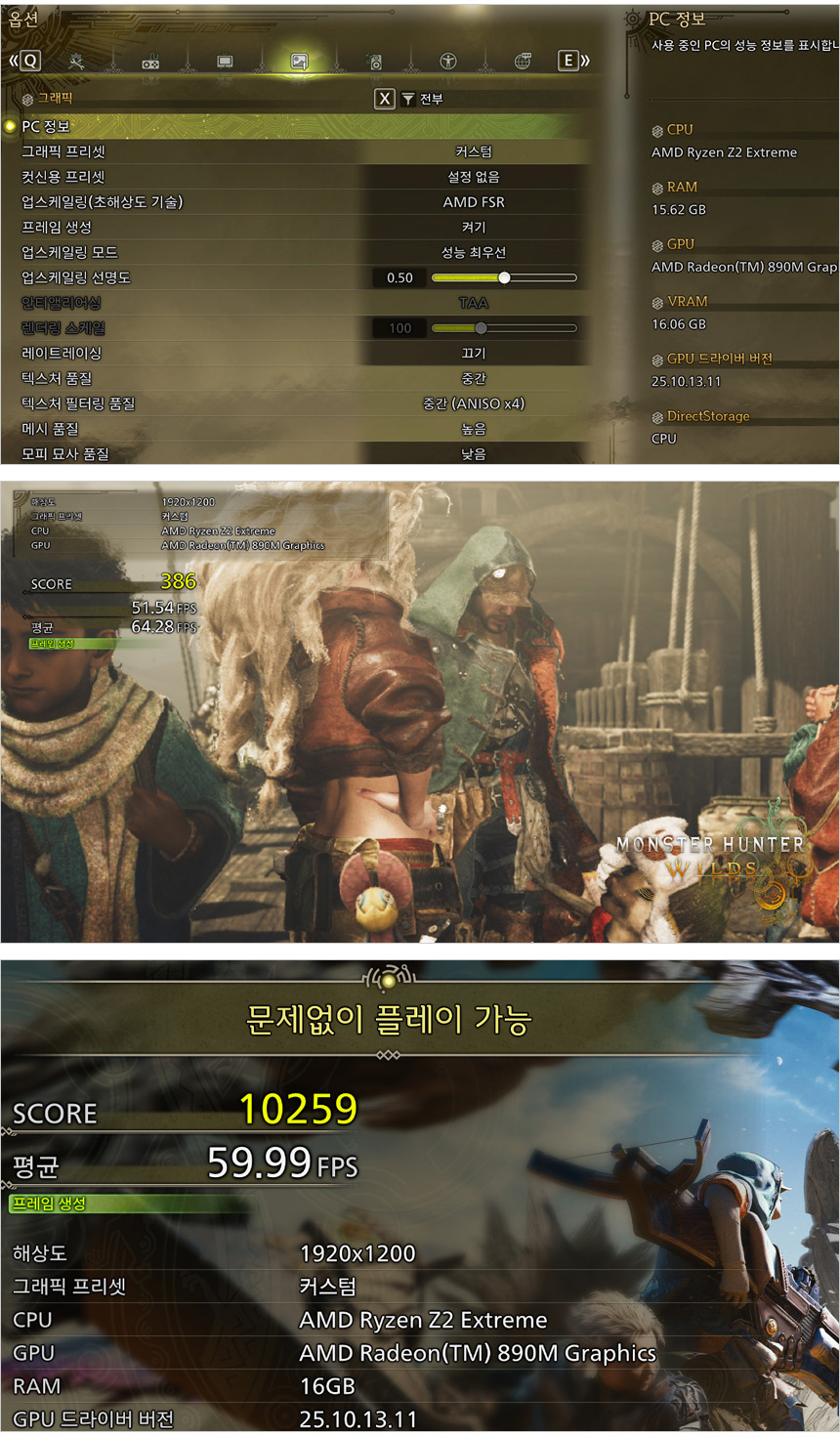 몬스터 헌터 와일드 벤치마크를 실행한 모습으로 중간 옵션에서 59.99프레임을 보여주었다. 낮음 옵션으로 설정해야 하는 경쟁 모델들과 달리 중간 옵션에서도 부드럽게 게임을 즐길 수 있을 것이다.