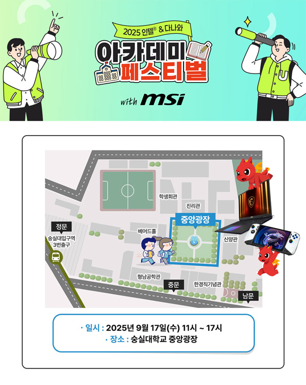 MSI는 오는 9월 17일(수) 숭실대학교 중앙광장에서 열리는 '인텔&다나와 아카데미 페스티벌'에 참가해 오프라인 체험 부스를 운영한다고 밝혔다.