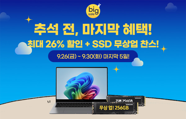 유니씨앤씨는 최신 인텔 코어 울트라 루나레이크 프로세서와 WQXGA+ Dynamic AMOLED 2X 터치스크린을 탑재한 삼성 갤럭시북5 프로 NT960XHA-K51A 대상으로 최대 58만원 할인과 최대 24개월 무이자 할부, SSD 무료 업그레이드, 한컴 오피스, RAM 더블업 특가 등의 다양한 사은 혜택이 증정되는 ‘한가위 빅세일’ 프로모션을 2025년 9월 26일부터 9월 30일까지 G마켓를 통하여 단독 진행한다.
