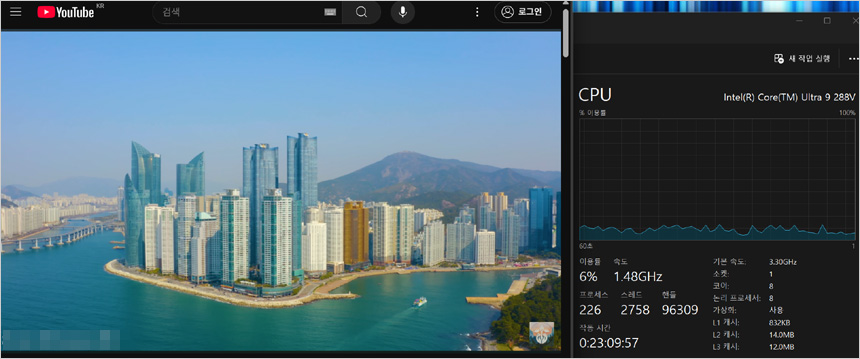 유튜브 고화질 동영상을 이용해 CPU 점유율을 테스트 하고 있는 모습으로 (2160P@60FPS) 5-11% 대의 점유율을 보여주었으며 인터넷을 실행했을 때 30% 초반까지 점유율이 올라가는 것을 확인할 수 있었다.
