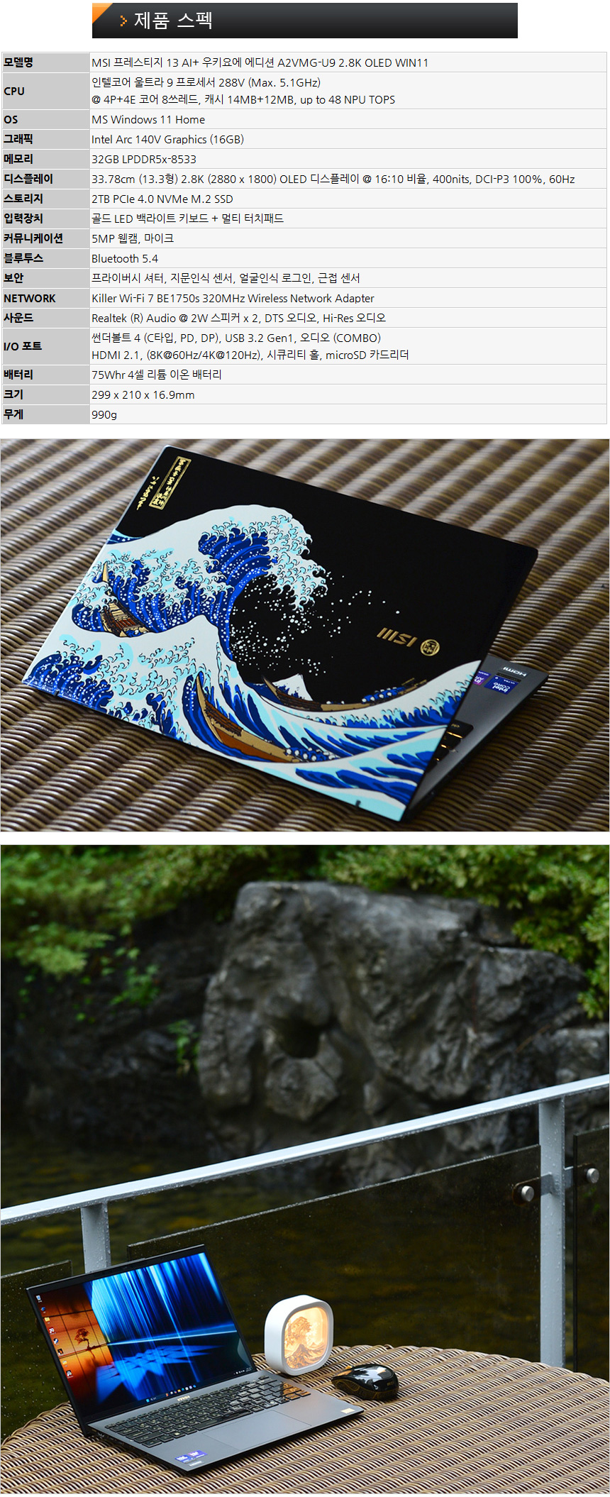 20년이 좀 못되는 기간동안 수를 헤아릴 수 없을만큼 다양한 노트북을 테스트 했는데 이정도로 유니크하고 아름다운 노트북을 본적이 없다. 보통 최상의 스펙을 보여주는 모델에게 프리미엄 이라는 단어를 사용하는데 MSI 프레스티지 13 AI+ 우키요에 에디션 A2VMG-U9 2.8K OLED WIN11 는 그 이상의 가치를 가진 노트북이라 평가하고 싶다.