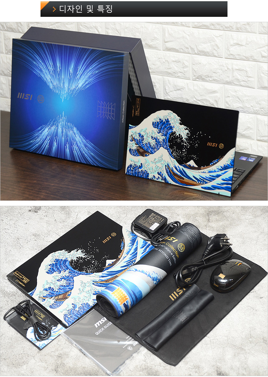 이번에 리뷰를 진행 할 MSI 프레스티지 13 AI+ 우키요에 에디션 A2VMG-U9 2.8K OLED WIN11 은 단순한 노트북이 아닌 예술품 같은 존재로 제품을 만드는 아티잔 컬렉션의 첫 모델로 넋을 잃고 한참을 바라봤을 만큼 아름다운 외관과 높은 마감 완성도가 매력적인 노트북이다. 상판에는 일본 에도시대 거장 가쓰시카 후쿠사이의 대표작 가나가와 해변의 높은 파도가 정교하게 새겨져 전통과 현대 기술이 교차하는 특별한 상징성을 전달하며 우키요에 감각을 현대적으로 재해석한 패턴이 바디 전반에 적용되어, 시각적 완성도를 한층 끌어올렸다.