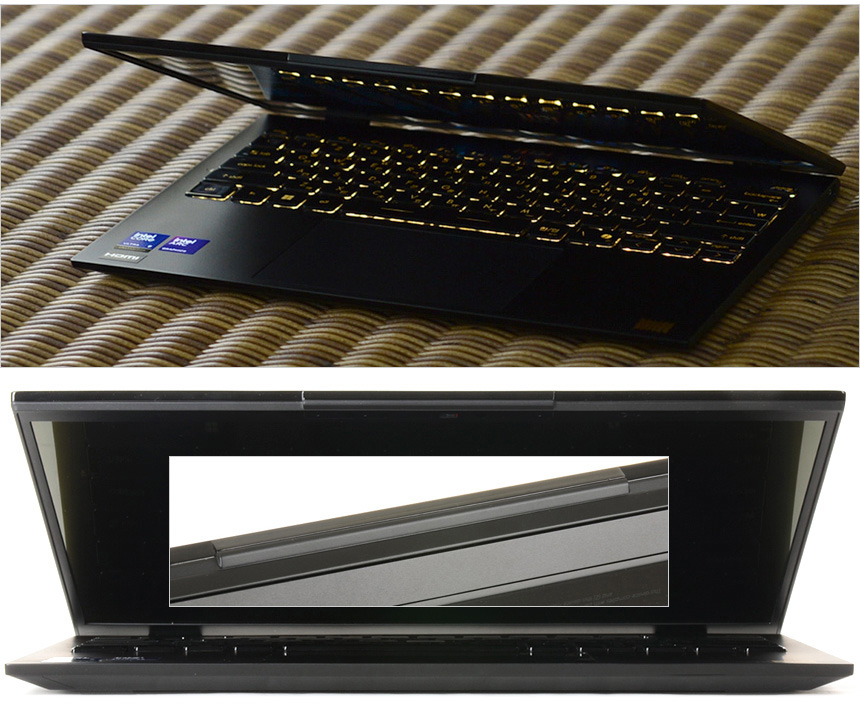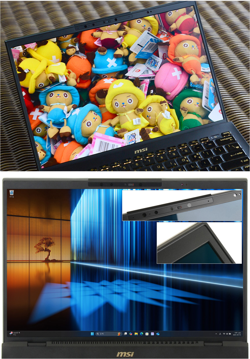 OLED 특유의 선명도를 극대화 하기 위해 글레어 타입을 적용했지만 반사로 인한 불편은 크지 않았으며 3면 슬림베젤을 적용해 높은 몰입감을 경험할 수 있었다. 또한 테두리 부분에는 디스플레이 범퍼가 설치되어 충격 등으로부터 패널을 보호한다. 상단 중앙에는 FHD 웹캠과 마이크가 장착되어 화상 채팅이나 셀프 촬영 용도로 활용할 수 있으며 일반 노트북과 달리 근접센서 등이 추가된 것도 눈에 띈다.