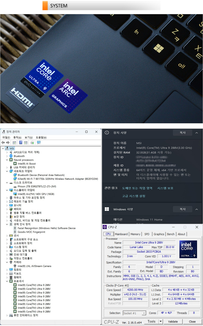시스템 정보를 확인하고 있는 모습으로 인텔의 최상급 루나레이크 프로세서 인텔코어 울트라 9 288V가 장착된 것을 확인할 수 있으며 32GB의 LPDDR5x 메모리와 2TB PCIe 4.0 NVMe SSD를 지원해 업무용 S/W 는 물론 고성능을 필요로 하는 작업용 프로그램도 부드럽게 실행할 수 있다.
