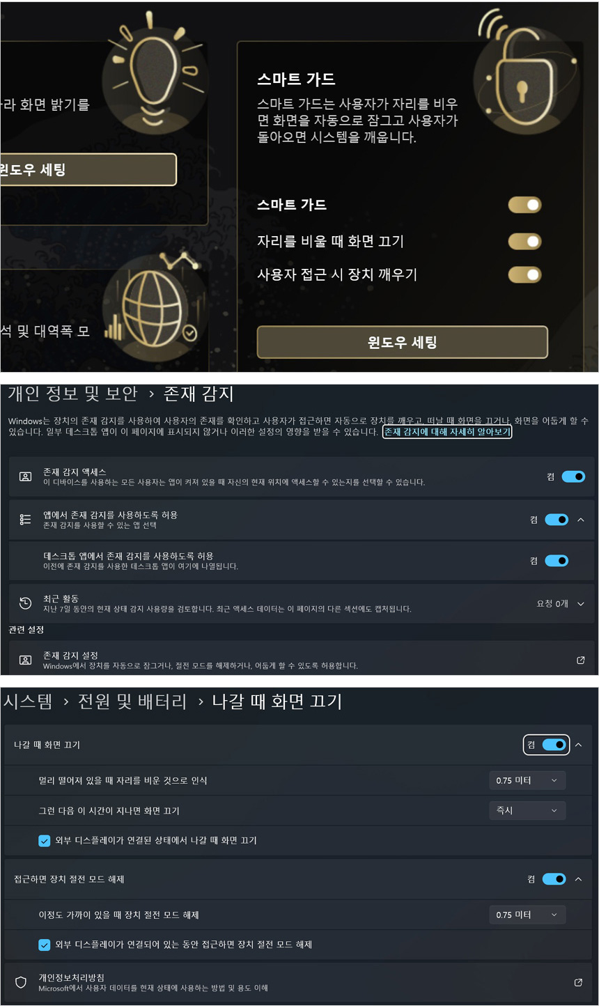 이 기능은 얼굴인식과 함께 사용하는 것을 권장한다. 외부에서 자리를 비우면 자동으로 화면이 꺼지며 노트북이 잠금 상태가 되며 사용자가 자리에 앉으면 얼굴을 인식해 자동으로 켜지며 로그인 된다. 세부 설정은 설정->개인정보 및 보안->존재감지->존재감지 설정에서 셋팅할 수 있다. (동영상을 보면 어떤 방식으로 작동하는지 쉽게 이해할 수 있을 것이다.)