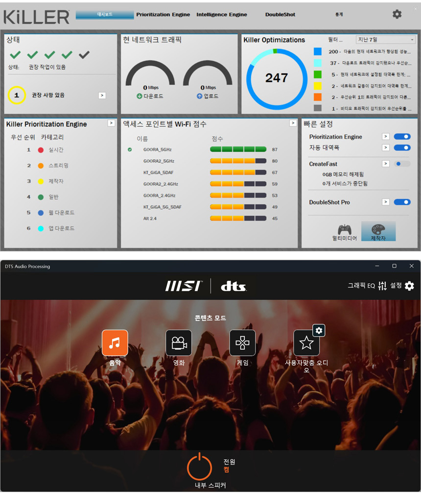 DTS 오디오를 지원해 사용자에 맞게 음색을 조정할 수 있으며 킬러랜 S/W를 제공해 네트워크 모니터링과 설정이 가능하다.