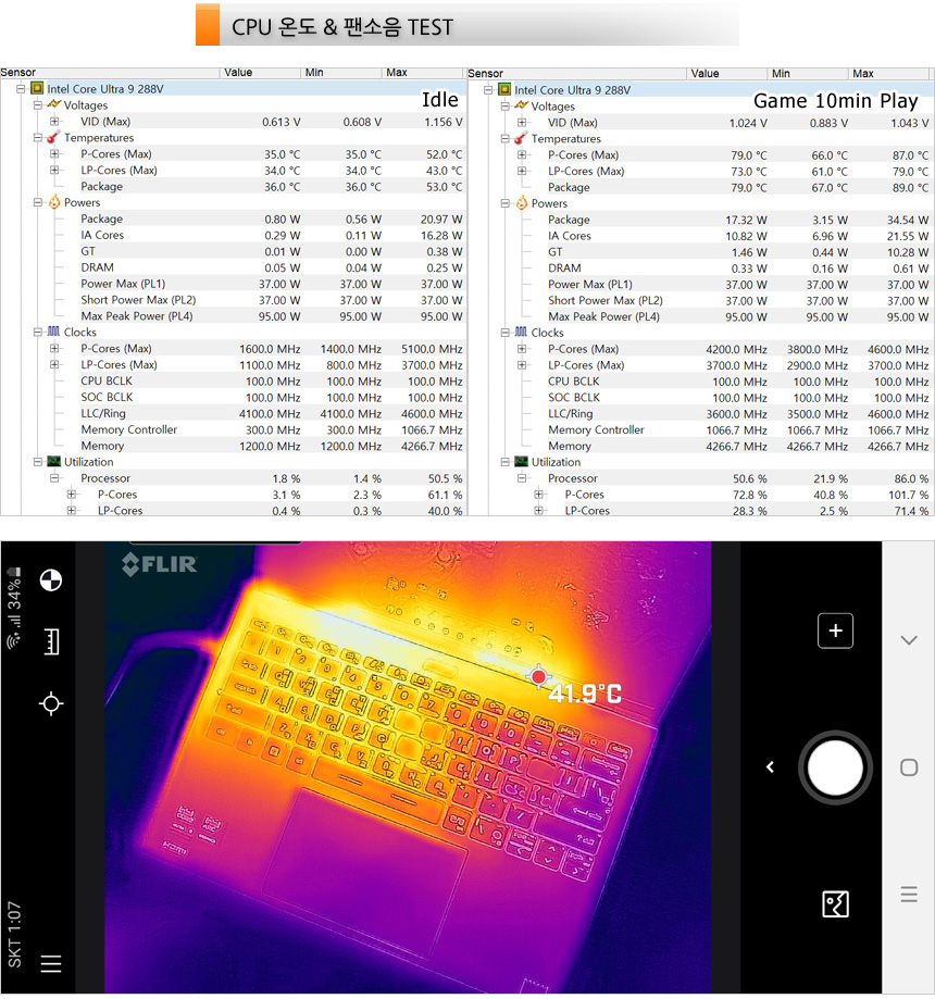 CPU 온도를 측정한 모습으로 (실내온도 25도, 최고성능 모드) 아무것도 하지 않은 IDLE 상태에서는 30도 중반으로 작동했으며 10분 동안 게임을 실행한 후 온도를 측정했을 때에는 80도 초반까지 온도가 올라가는 것을 확인할 수 있었다. (CPU 사용율이 극히 높은 랜더링 등의 작업시에는 온도가 더 높아진다.) 또한 열화상 카메라를 이용해 게임 실행중 노트북의 열분포를 확인하고 있는 모습으로 칩셋이 설치된 좌측 상단을 중심으로 열이 형성된 것을 확인할 수 있다. 팜래스트 온도는 낮아 불편없이 타이핑 할 수 있었다.