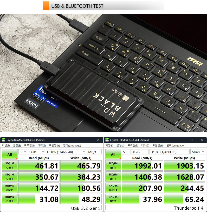 썬더볼트 4 단자를 지원해 빠른 데이터 전송이 가능하다. 상단의 사진은 외장 SSD (USB 3.2 Gen2x2 지원모델) 를 이용해 테스트를 진행하고 있는 모습으로 USB 3.2 Gen1과 확연한 차이를 보여주는 것을 확인할 수 있다.