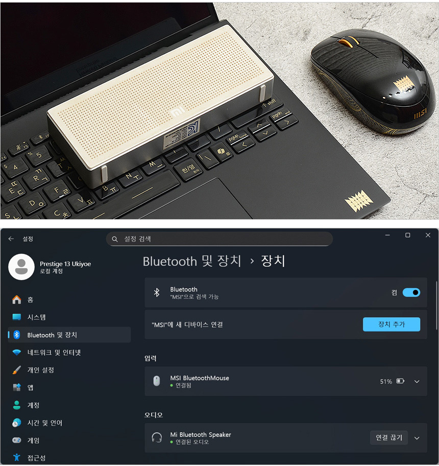 블루투스를 지원해 다양한 주변기기를 무선으로 연결할 수 있다. 상단의 사진은 스피커와 마우스의 연결 모습으로 원활하게 페어링 되는 것을 확인할 수 있었으며 완벽하게 작동했다.