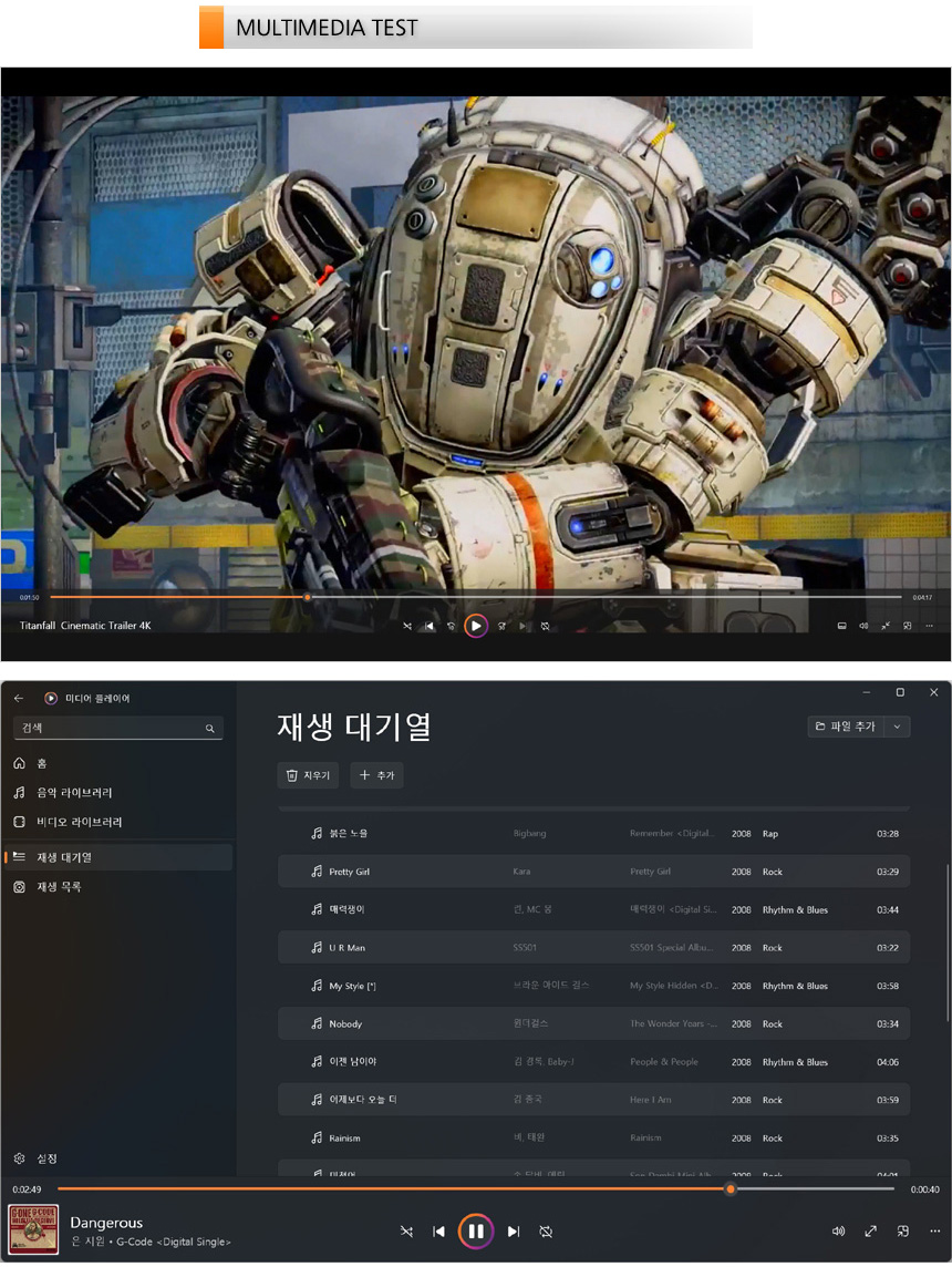 4K 동영상을 이용해 멀티미디어 테스트를 진행하고 있는 모습으로 디스플레이 크기는 작지만 OLED 특유의 선명한 화질에 시원한 사운드까지 더해져 만족스럽게 영상을 즐길 수 있었다. (외부에서 고화질 영상을 주로 감상한다면 아주 좋은 선택이 될 것이다.) 또한 MP3 파일을 이용해 스피커 사운드 테스트를 진행했는데 최고급형 모델답게 사무실을 가득 울리는 시원한 소리를 들려 주었다. 중고음 뿐만 아니라 일정수준 이상의 저음 재생으로 듣기좋은 소리를 들려 주었으며 최대 볼륨에서도 노이즈 없는 깔끔한 소리를 즐길 수 있었다.