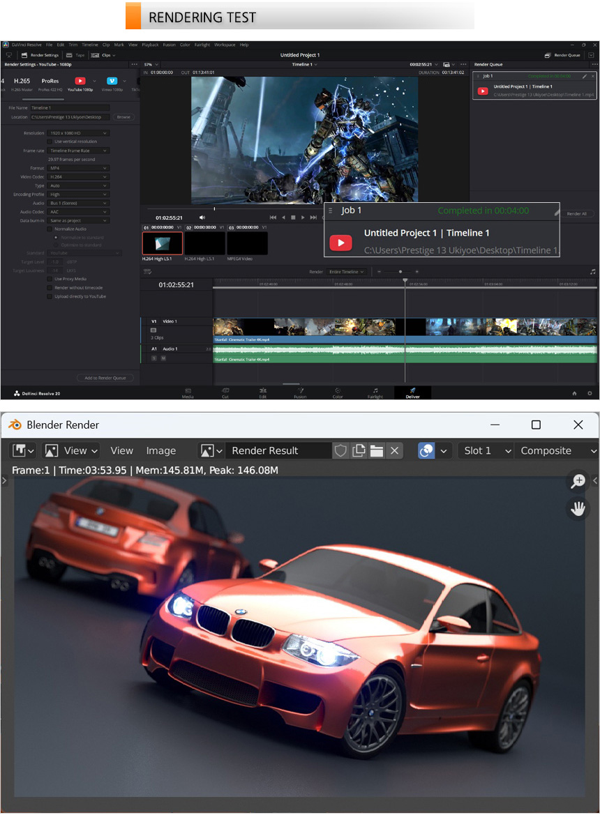 영상편집 S/W 다빈치 리졸브를 이용해 랜더링 테스트를 진행하고 있는 모습으로 (640MB, 920MB, 990MB 4K 동영상을 단일 동영상으로 랜더링, FHD 해상도에 H.264 비디오 코덱) 4분이 소요되는 것을 확인할 수 있었으며 블랜더 랜더링 테스트 에서는 3분 53초의 빠른 속도를 보여주었다. (내장그래픽 기반의 노트북임에도 영상편집 랜더링 시간이 대단히 짧은 것이 인상적이다.)