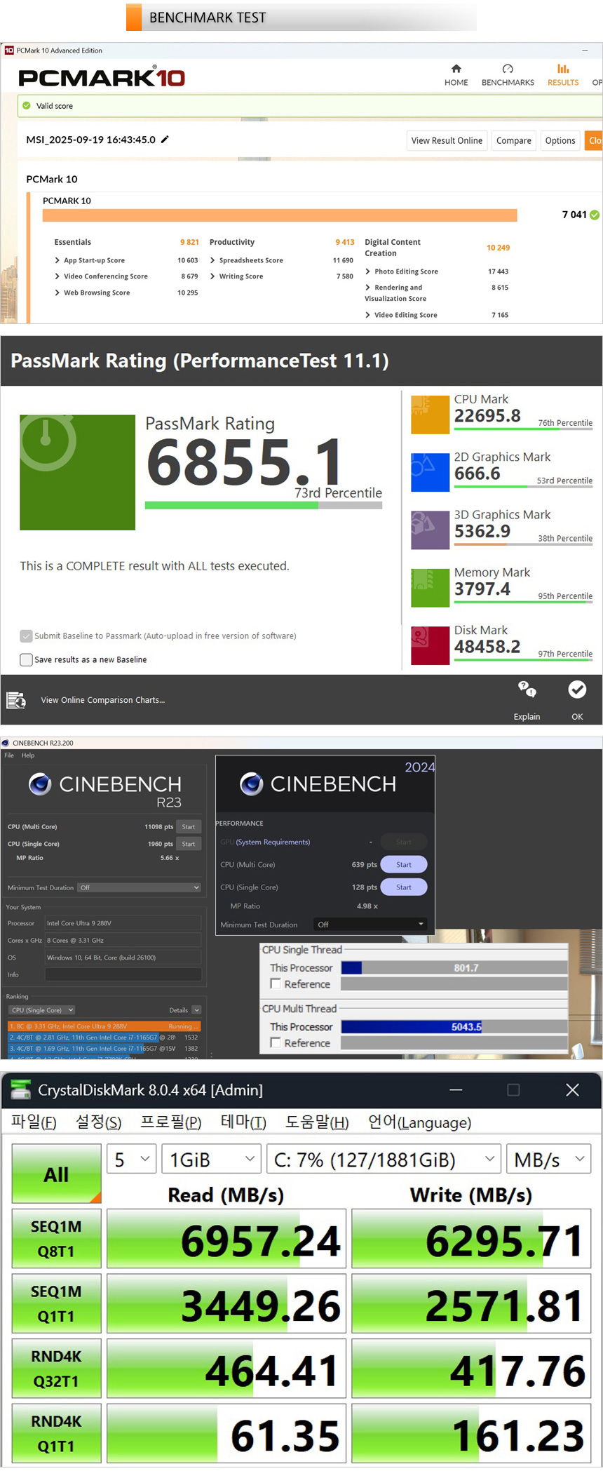 벤치마크 프로그램을 이용해 성능 테스트를 진행하고 있는 모습으로 보급형 노트북과 확연히 비교되는 높은 스코어를 보여주었다. 캐주얼한 작업 뿐만 아니라 고성능을 필요로 하는 S/W도 부드럽게 실행할 수 있는 노트북이다. 또한 저장장치의 속도를 확인하고 있는 모습으로 PCIe 4.0 인터페이스 지원 모델답게 빠른 속도를 보여주었다. (읽기 뿐만 아니라 쓰기 속도도 대단히 빠르다.) 특히 2TB 대용량을 지원해 여유롭게 프로그램을 설치하고 컨텐츠를 저장할 수 있다.