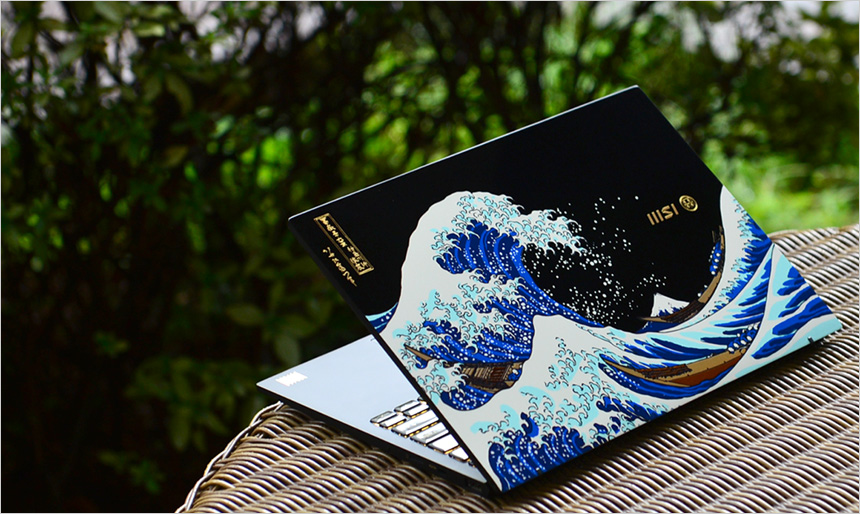 전세계 2,000대만 한정 판매되는 MSI 프레스티지 13 AI+ 우키요에 에디션 A2VMG-U9 2.8K OLED WIN11 은 일본 미술사에서 가장 상징적이고 사랑받는 작품 중 하나인 [가나가와 해변의 높은 파도아래]를 숙련된 장인이 수작업으로 제작했다. 400년 전통 야마나카 옻칠으로 적용하고 여러번의 인쇄 과정을 통해 그림이 프린팅된 일반 노트북과 달리 특유의 질감을 느낄 수 있다.