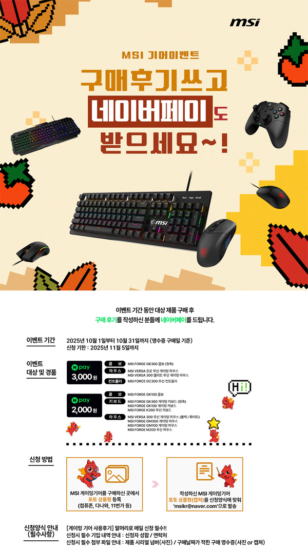 MSI는 MSI 인기 게이밍기어 구매 고객을 대상으로 10월 한 달간 사용 후기 이벤트를 진행한다고 밝혔다. 참여 고객에게는 제품별 2,000원~3,000원 상당의 네이버페이 포인트가 선착순으로 지급된다.