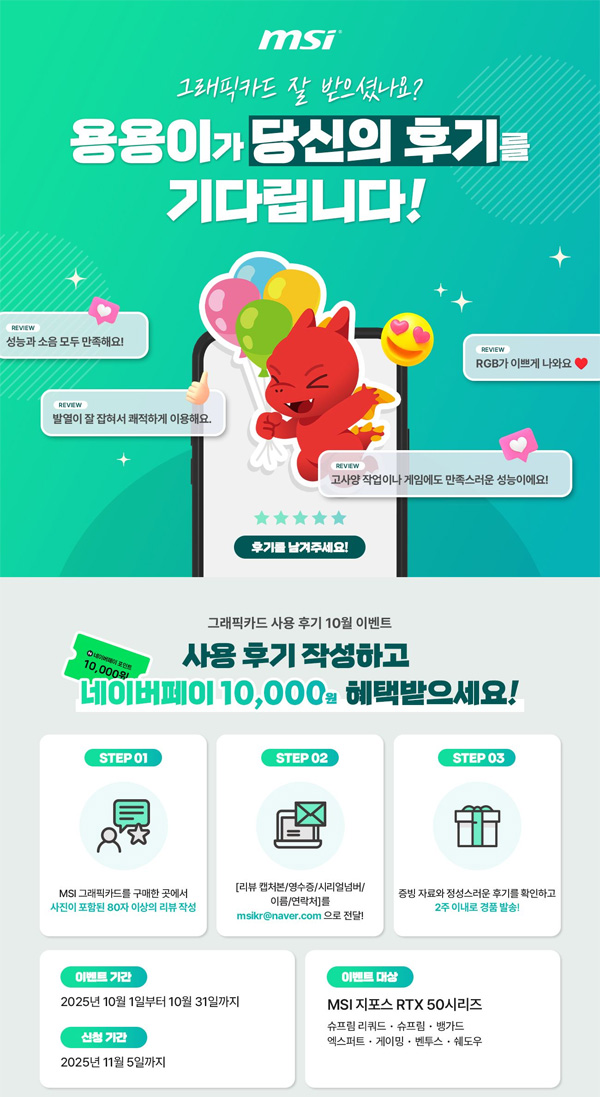 포토 후기 이벤트는 강력한 성능을 자랑하는 MSI 지포스 RTX 50 시리즈 그래픽카드를 구매한 고객들에게 감사의 마음을 전하고, 제품에 대한 생생한 경험을 공유하는 장을 마련하기 위해 기획되었다.
