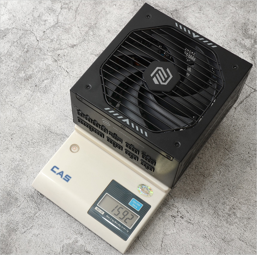 무게를 측정한 모습으로 1Kg 초반에 불과한 보급형 파워서플라이와 달리 무게가 상당한 것을 확인할 수 있다. 참고로 파워 서플라이가 무거운 것은 절대 단점이 아니다. 무게가 늘어난 만큼 안정성을 높이는 다양한 부품이 추가된 것으로 이해하면 될 것이다.