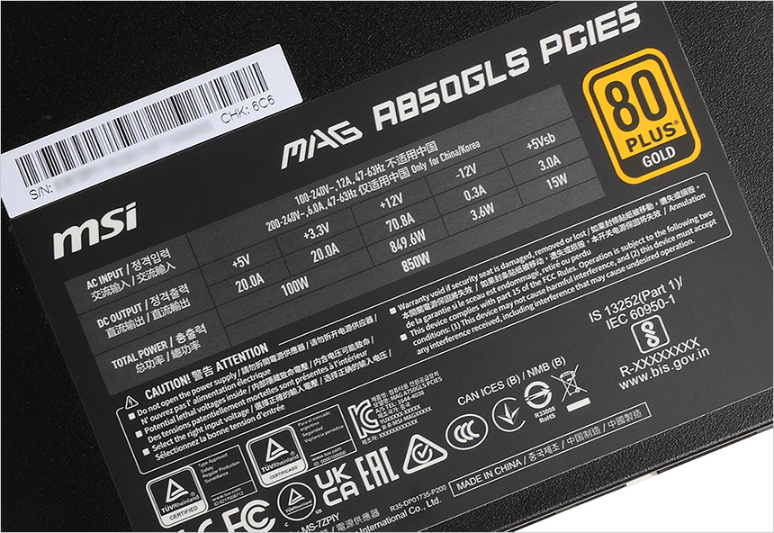 바닥면의 모습으로 제품 스펙을 확인할 수 있는 스티커가 부착된 것을 확인할 수 있다. 국내 정식 수입된 모델답게 KC인증을 획득 했으며 80 PLUS 스탠다드나 브론즈 등을 지원하는 보급 및 중급형 모델들과 달리 80 PLUS GOLD 의 높은 전력효율 지원으로 불필요한 전기세 낭비를 최소화 할 수 있다.