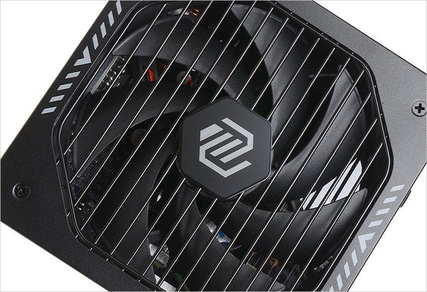 파워 서플라이 상단의 모습으로 135mm 팬이 설치되어 있고 팬의 파손을 방지하기 위해 그릴이 설치된 것을 확인할 수 있다. 대형팬을 사용해 높은 풍량을 자랑하며 6만 시간의 수명을 가진 향상된 Fluid Dynamic 베어링이 장착되어 있고 도입부에서 강조한 것과 같이 최고급 부품을 사용해 소음을 최소화 했다. 최대 18dB 수준의 소음으로 사이베네틱스 LAMBDA A+ 소음등급 인증을 획득한 제품으로 정숙한 사용환경을 만들 수 있다.