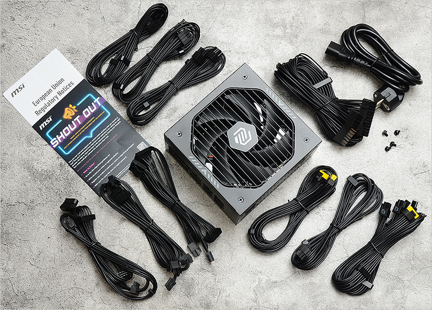 풀KIT 의 모습으로 풀 모듈러 모델답게 케이블이 별도로 제공되는 것을 확인할 수 있다. 메인보드 연결을 위한 24핀 ATX 케이블을 비롯해 그래픽카드 연결을 위한 총 4개의 케이블 (PCIe 케이블 2개, 12+4핀 PCIe 케이블, 6+2핀 PCIe 케이블) 이 제공되며 CPU 전원 공급을 위한 2개의 EPS12V 8핀 케이블과, SATA & 4핀 (FDD) 케이블 3개가 포함되어 여유롭게 각종 부품에 전원을 공급할 수 있다. (전원 케이블과 조립을 위한 볼트도 포함되어 있다.)