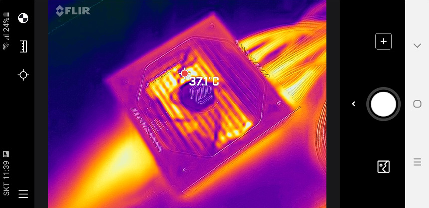 벤치 실행시 표면온도를 열화상 카메라로 확인한 모습으로 (실내온도 21도) 온도가 높은 CPU나 그래픽카드, 메인보드 전원부 등과 달리 파워 서플라이 온도는 상당히 낮은 것을 확인할 수 있다 또한 팬소음도 확인했는데 (수랭쿨러와 그래픽카드 소음 때문에 귀를 가까이 대고 테스트를 진행했다.) 거의 들리지 않았다. 어떤 환경에서도 파워서플라이 소음으로 인한 불편은 느끼지 않을 것이다.