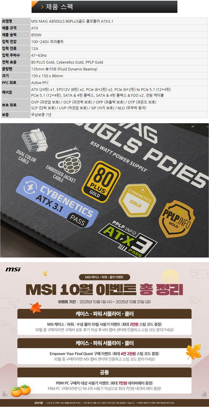 이번에 출시된 MSI MAG GLS 시리즈는 리뷰를 진행하는 850W 모델 뿐만 아니라 1000W의 MAG A1000GLS PCIE5.1, 750W MAG A750GLS PCIE5.1, 650W MAG A650GLS PCIE5.1 등 총 4종으로 출시되어 사용 시스템을 고려해 원하는 제품을 선택할 수 있다. (그래픽카드에 따라 제품을 선택하면 된다.) MSI 에서는 파워서플라이 구매자를 대상으로 스팀코드 증정 이벤트도 진행하고 있다. 제품을 구입했다면 사용기 등을 작성해 꼭 혜택을 받기 바란다.