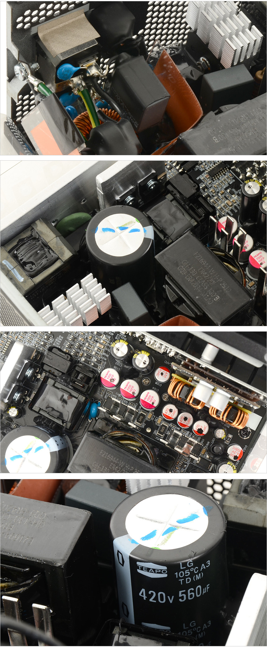 제품 내부의 모습으로 안정성을 높이기 위해 방열판이 부착된 것을 확인할 수 있으며 TEAPO 커패시터와 콘덴서가 장착된 것을 확인할 수 있다. 이 제품은 100% 서버등급 105℃ 최고급 커패시터를 사용해 효율적인 전력 변환은 물론 높은 안전성을 제공하며 PFC와 LLC를 제어하기 위해 IC를 탑재해 정확도를 크게 향상 시켰다.