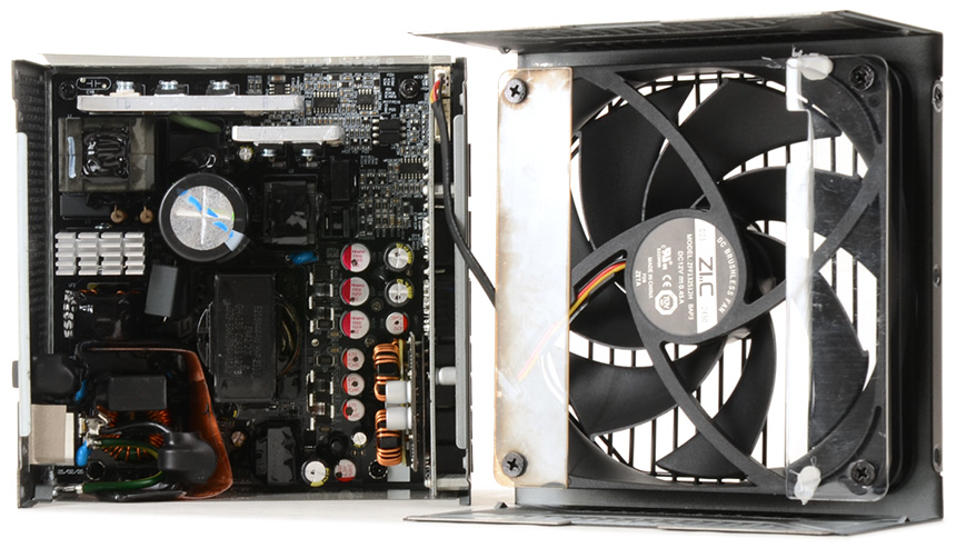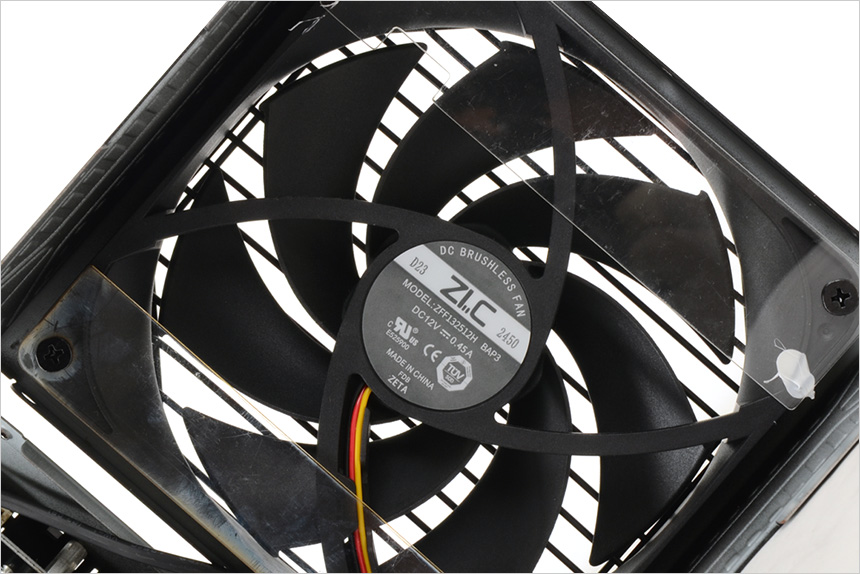 파워 서플라이 내부의 모습으로 상단 커버에 135mm 팬이 설치된 것을 확인할 수 있다. 저속으로 회전해 소음을 최소화 했으며 높은 풍량으로 내부의 각종 부품의 열을 빠르게 식혀준다. @ 제품을 개봉해 보증 스티커가 훼손될 경우 A/S 에 제약이 있을 수 있다. 먼지 청소 등을 이유로 제품을 개봉하지 말기 바란다.