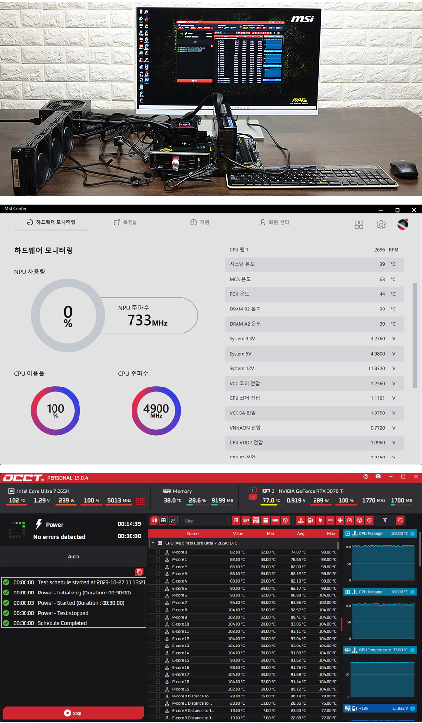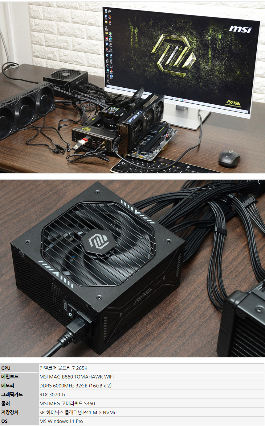 테스트를 위해 PC를 셋팅한 모습으로 인텔코어 울트라 7 265K를 비롯해 MSI MAG B860 TOMAHAWK WIFI 메인보드와 2개의 DDR5 메모리, RTX 3070 Ti 그래픽카드를 사용했다.
