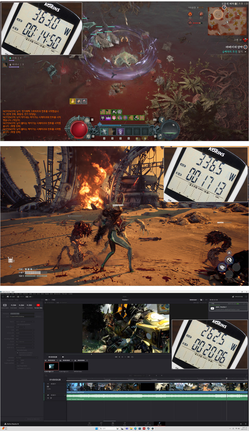 게임과 영상편집시 소비전력을 확인하고 있는 모습으로 벤치마크 보다는 훨씬 낮은 소비전력으로 작동하는 것을 확인할 수 있었다. 참고로 RTX 5070 Ti와 RTX 5080 이 부스트시 최대 350W 까지 소비전력이 높아진다. MSI MAG A850GLS 80PLUS골드 풀모듈러 ATX3.1 는 850W를 지원하기 때문에 RTX 5080 이하의 그래픽카드를 사용하는데 불편은 없을 것이다.