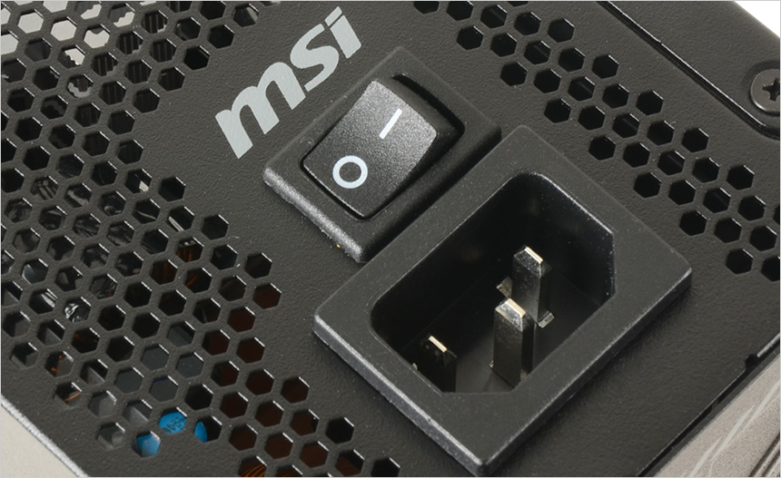 파워 서플라이 후면부의 모습으로 원활한 공기 순환을 위해 벌집 모양의 통풍구가 설치되어 있고 측면에는 전원 스위치와 전원 단자가 장착된 것을 확인할 수 있다. 참고로 이 제품은 10배 정도의 입력 전압 변동을 견딜 수 있는 100V~240V 프리볼트 설계로 안정성을 높였으며 환경에 제약없이 사용할 수 있는 장점을 가지고 있다.