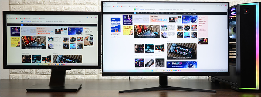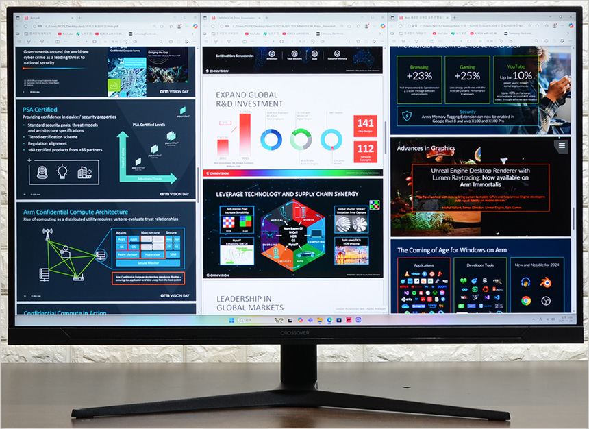 4K 해상도 지원으로 넓은 작업영역을 제공한다. 사진과 같이 3개의 웹페이지를 띄어두고 작업할 수 있어 게임이나 동영상 감상은 물론, 멀티테스킹 용도로도 손색이 없다. 참고로 문자가독성을 높이는 크로마서브 샘플링 4:4:4 모드 지원으로 편하게 글을 읽을 수 있었다.