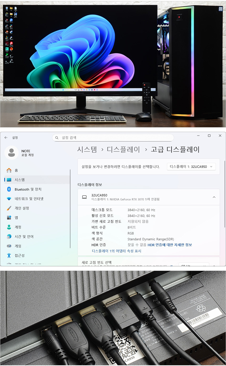 테스트를 위해 책상에 설치한 모습으로 32형 대화면 모니터 답게 많은 공간을 필요로 했다. 슬림 베젤을 적용해 크기를 줄이긴 했지만 기본 크기가 상당하기 때문에 디자인 부분에서 언급한 것과 같이 넉넉한 공간 확보는 필수적이다. DP와 2개의 HDMI 2.0 단자를 지원해 PC뿐만 아니라 게임콘솔과 손쉽게 연결해 사용할 수 있으며 C타입 단자를 제공해 스마트폰 영상을 대화면으로 즐길 수 있다.