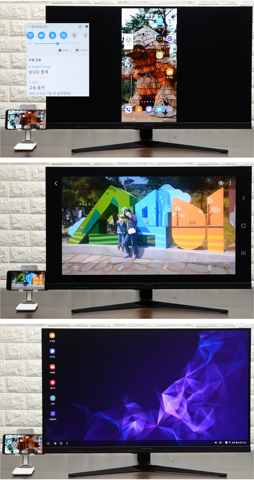 C타입 단자를 지원해 스마트폰 영상을 대화면으로 즐길 수 있다. 삼성 DEX를 지원하는 스마트폰을 사용하고 있을 경우 스마트폰 연결만으로 PC처럼 활용할 수 있으며 (키보드와 마우스는 스마트폰에 블루투스로 연결하면 된다.) PD충전을 지원하는 모뎁답게 연결즉시 스마트폰이 충전되는 것도 확인할 수 있었다. @ 참고로 충전은 모든 스마트폰에서 가능하지만 화면 출력은 미러링을 지원하는 스마트폰에서만 가능하다.