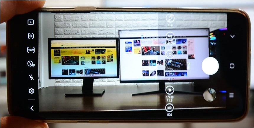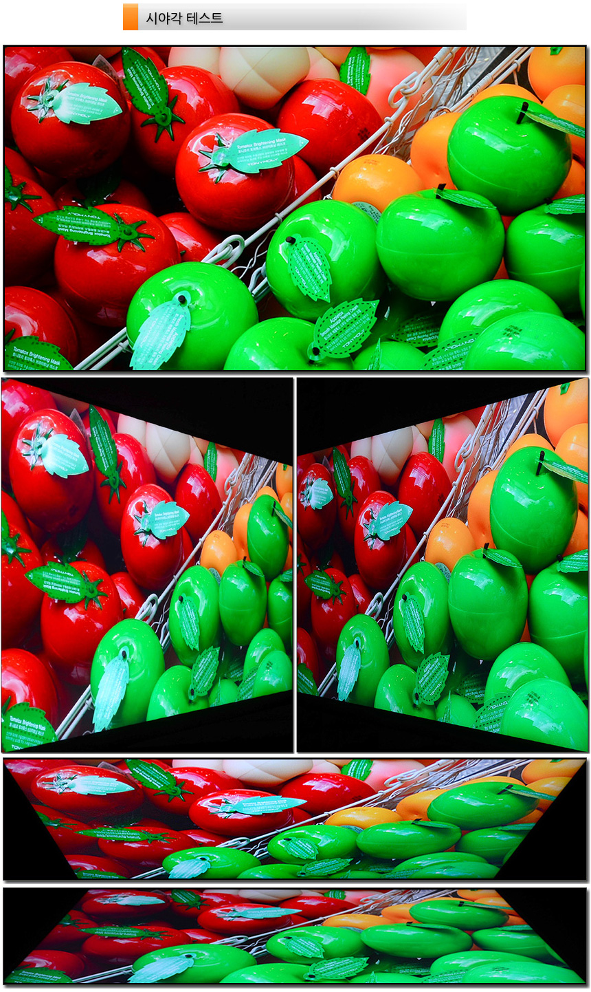 프리미엄 IPS 모듈 패널을 탑재한 모니터 답게 시야각의 불편없이 사용할 수 있다. 상단의 사진은 시야각 테스트를 진행한 모습으로 극단적인 각도에서도 채도저하나 반전은 발생하지 않는 것을 확인할 수 있었다.