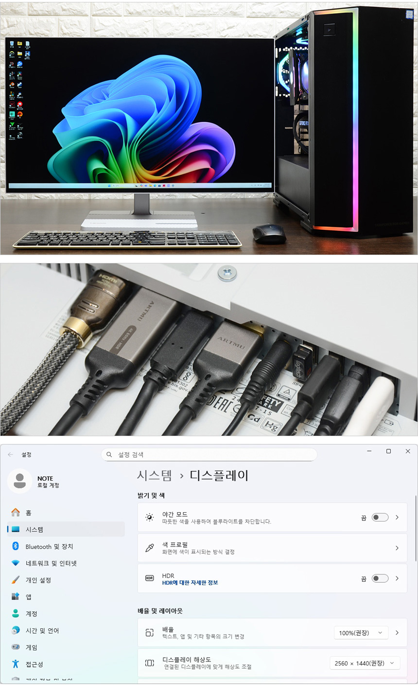 테스트를 위해 PC와 모니터를 책상에 셋팅한 모습으로 슬림 베젤을 적용한 27형 모델답게 많은 공간은 차지하지 않았다. 무게감이 느껴지기는 하지만 크기는 크지 않아 협소한 집이나 사무실 책상에 쉽게 설치해 사용할 수 있을 것이다. 이 제품은 사용자의 PC나 노트북 환경에 따라 DP, HDMI, C타입 단자중 하나를 선택하면 된다. (보통 PC에서는 DP 단자가 주로 사용되며 HDMI 는 노트북이나 게임콘솔, OTT 플레이어, C타입은 스마트폰이나 게이밍 핸드헬드, 슬림 노트북 등과 연결하는데 사용된다.)