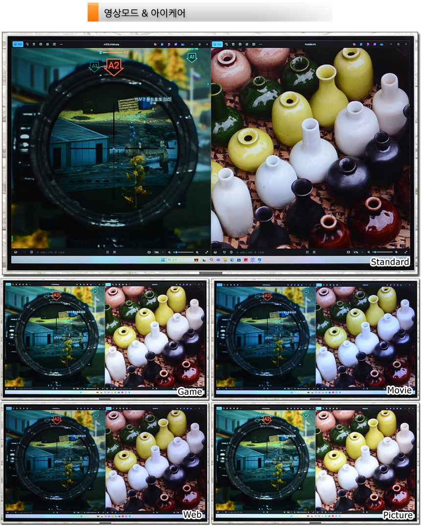 다양한 디스플레이 모드를 지원해 컨텐츠에 최적화된 영상을 편하게 즐길 수 있다. 상단의 사진은 지원모드의 모습으로 색이나 밝기 등이 달라지는 것을 확인할 수 있다. (일일이 밝기와 명암을 조정할 필요가 없다.)