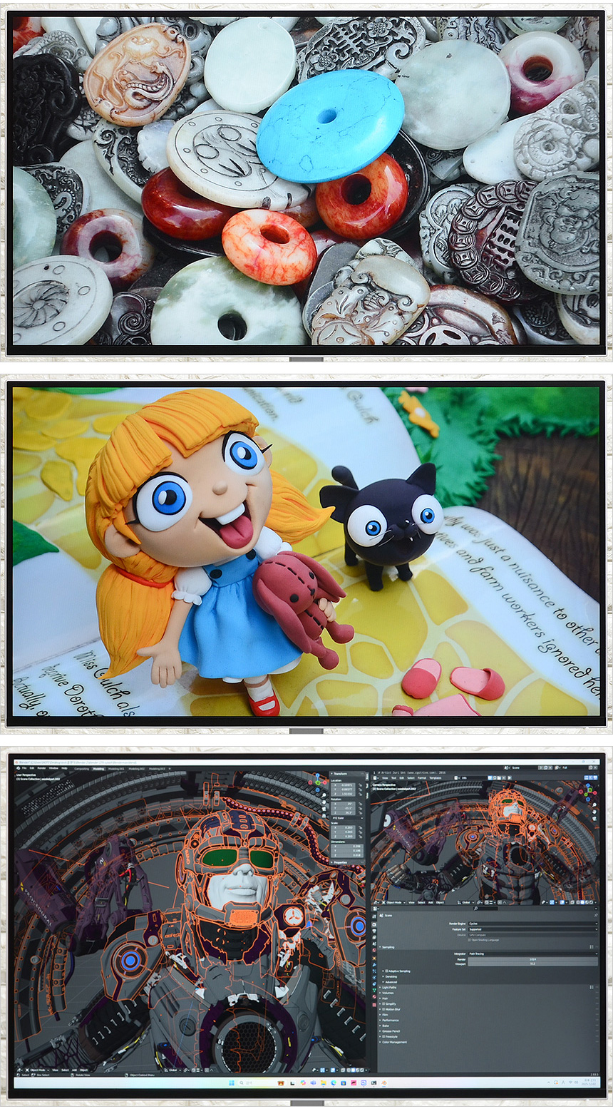 JPG 원본 사진을 재생하고 있는 모습으로 보급형 패널을 사용한 FHD 모니터와 확연히 비교되는 디테일을 경험할 수 있었다. 특히 밝기가 상당히 높은 편으로 자연광이 비추는 창가에서도 높은 시인성을 보여 주었으며 안티글레이 타입이 적용되어 반사로 인한 불편도 적었다. 이 제품은 조밀한 픽셀피치로 얼굴의 잡티나 머리카락, 가는선 등을 뭉개짐 없이 깔끔하게 표현해 주었다. 높은 디테일이 필수적인 인물사진 편집이나 캐드, 랜더링 등의 전문 작업용으로도 유용하게 활용할 수 있을 것이다.