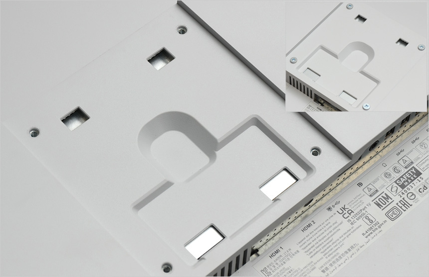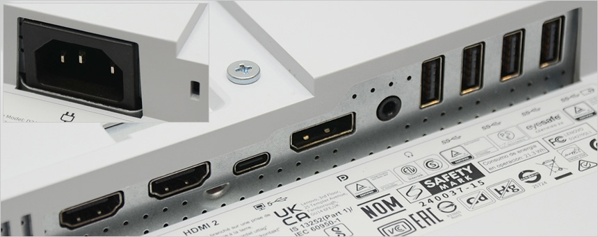 툴리스 방식으로 손쉽게 스탠드를 탈부착 할 수 있으며 내부에는 100mm 베사홀이 설치되어 벽에 걸거나 ARM 등이 장착해 활용할 수 있다. 하단에는 2개의 HDMI 와 DP 단자가 설치되어 있고 전원 단자와 오디오 Out 단자, 도난 방지를 위한 시큐리티 홀을 지원한다.