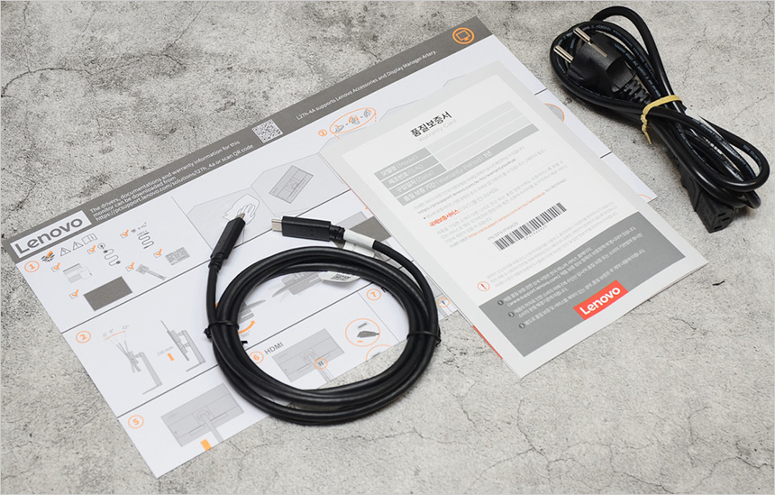 기본 제공되는 액세서리의 모습으로 전원 케이블과 C타입 케이블을 비롯해 퀵 매뉴얼, 보증서가 포함된 것을 확인할 수 있다.