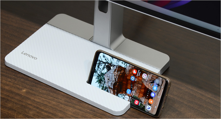 스탠드 전면에는 홈이 설치되어 스마트폰 등을 거치할 수 있다. (실시간으로 문자나 SNS 등을 확인해야 할 경우 유용하게 활용할 수 있을 것이다.)